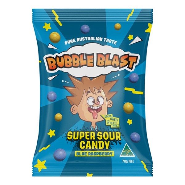 BUBBLE BLAST SUPER SOUR CANDY BLUE RASPBERRY PEG BAG 70G X 12 PACK