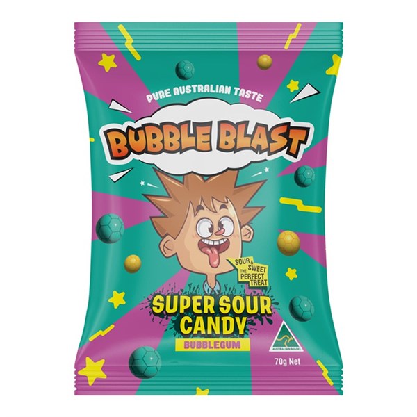 BUBBLE BLAST SUPER SOUR CANDY BUBBLE GUM PEG BAG 70G X 12 PACK