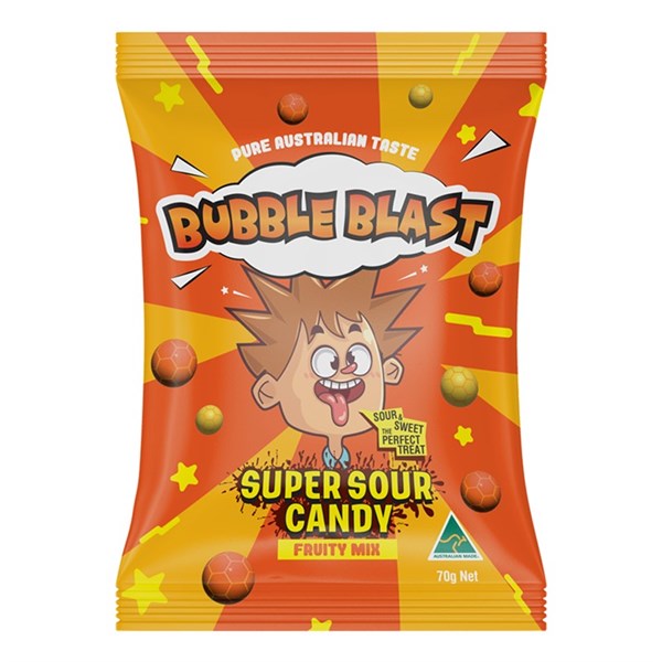 BUBBLE BLAST SUPER SOUR CANDY FRUITY MIX PEG BAG 70G X 12 PACK