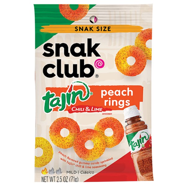 SNACK CLUB TAJIN PEACH RINGS PEG BAG 64G X 12 PACK