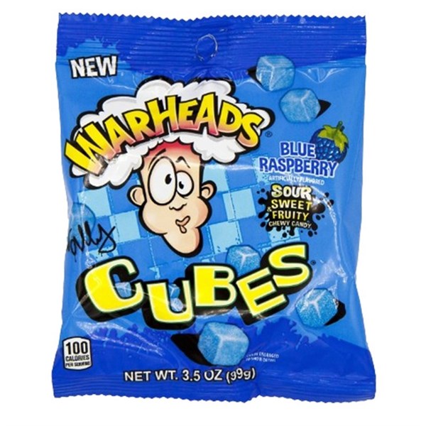 WARHEADS BLUE RASPBERRY CUBES PEG BAG 99G X 12 PACK